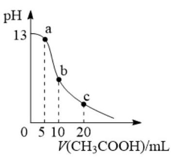 - A. A. Figure 1 shows the pH change curve of adding $0.1 \mathrm {~mol} \cdot \mathrm {~L} ^ { - 1 } \mathrm { CH } _ { 3 } \mathrm { COOH }$ drop by drop to a NaOH solution of volume $10 \mathrm {~mL} 0.1 \mathrm {~mol} \cdot \mathrm {~L} ^ { - 1 }$ at room temperature, then point c has: $\mathrm { c } \left( \mathrm { CH } _ { 3 } \mathrm { COOH } \right) + 2 \mathrm { c } \left( \mathrm { H } ^ { + } \right) = 2 \mathrm { c } \left( \mathrm { OH } ^ { - } \right) + \mathrm { c } \left( \mathrm { CH } _ { 3 } \mathrm { COO } ^ { - } \right)$