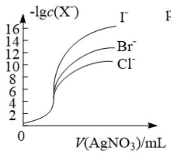 C. In Figure 3, when the values of the horizontal coordinates are equal, the larger the value of the vertical coordinate, the smaller $c \left( \mathrm { X } ^ { - } \right)$ is, and the smaller its solubility product constant is, according to Figure 3, when the horizontal coordinates are the same, $c \left( \mathrm { Cl } ^ { - } \right) > c \left( \mathrm { Br } ^ { - } \right) > c \left( \mathrm { I } ^ { - } \right)$, then $K ( \mathrm { AgCl } ) > K ( \mathrm { AgBr } ) > K ( \mathrm { AgI } )$, and the $0.0100 \mathrm {~mol} / \mathrm { L }$ is used as $0.0100 \mathrm {~mol} / \mathrm { L }$, so B is correct. FORMULA_17]] silver nitrate standard solution, titration of the concentration of both $0.1000 \mathrm {~mol} / \mathrm { LCl } ^ { - } , \mathrm { Br } ^ { - }$ and $\mathrm { I } ^ { - }$ mixed solution, the solubility product constant is small Mr. into the precipitate, so the first precipitation is $\mathrm { I } ^ { - }$, so C is correct;