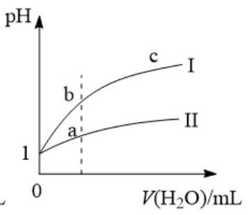 D. pH is the same monohydric acid diluted the same times, pH value change is larger acidic, hydrochloric acid is a strong acid, acetic acid is a weak acid, then pH value of the same hydrochloric acid and acetic acid diluted the same number of times, the pH value of the larger change is hydrochloric acid, so the I said hydrochloric acid, II said acetic acid; the strength of the conductivity of the solution and the concentration of ions proportional to the $c \left( \mathrm { H } ^ { + } \right) : \mathrm { a } > \mathrm { b } > \mathrm { c }$, the solution conductivity: $\mathrm { a } > \mathrm { b } > \mathrm { c }$, so D error;