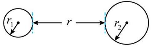 如图所示,两个质量分布均匀的实心球,半径分别为 $r _ { 1 } = 0.4 \mathrm {~m} , r _ { 2 } = 0.6 \mathrm {~m}$ ,质量分别为 $m _ { 1 } = 4.0 \mathrm {~kg} , m _ { 2 } = 1.0 \mathrm {~kg}$ ,两球间距离为 $r = 2.0 \mathrm {~m}$ ,则两球间相互引力的大小为