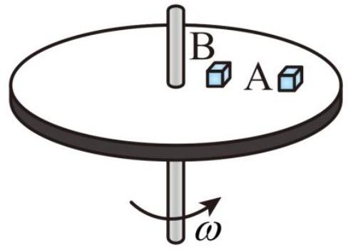 质量相等的 A , B 两物体置于绕坚直轴匀速转动的水平圆盘上, A 与转轴的距离是 B与转轴距离的 2 倍,且始终相对于圆盘静止,则两物体