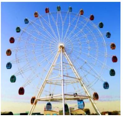 如图,一质量为 20 kg 的小朋友乘坐摩天轮,随座舱做匀速圆周运动.若小朋友做圆周运动的半径为 50 m ,角速度为 $0.2 \mathrm { rad } / \mathrm { s }$ ,则小朋友所需的向心力大小为