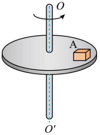 如图所示,水平圆台转动的角速度 ${ } ^ { \omega = 0.6 \mathrm { rad } / \mathrm { s } \text { ,质量为 } { } ^ { 0.2 \mathrm {~kg} } \text { 的小物块 } A \text { 放在距离轴 } }$心 1 m 处与圆台相对静止一起转动,小物块受到的静摩擦力大小为