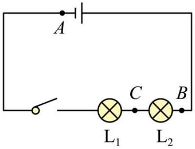 开关闭合后,将电压表接 $A , B$ 端显示 6 V ,将电压表接 $A , C$ 端显示 2 V ,则 $\mathrm { L } _ { 1 } , \mathrm {~L} _ { 2 }$ 两灯泡电阻之比