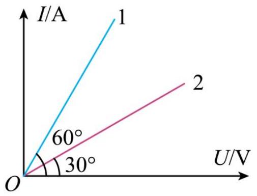 两电阻 $R _ { 1 } , R _ { 2 }$ 的电流 $I$ 和电压 $U$ 的关系如图所示,可知电阻大小之比 $R _ { 1 } : R _ { 2 }$ 等于( )