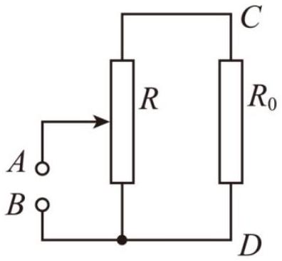 如图所示,$A B$ 两端接直流稳压电源,$U _ { A B } = 100 \mathrm {~V} , R _ { 0 } = 40 \Omega$ ,滑动变阻器总电阻 $R = 20 \Omega$ ,当滑动片处于变阻器中点时,$C , D$ 两端电压 $U _ { C D }$ 为( )