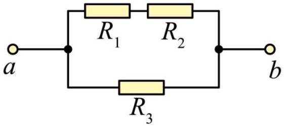 如图所示电路中,电阻 $R _ { 1 } , R _ { 2 } , R _ { 3 }$ 的阻值相同,将 $a , b$ 分别接到电源两端,则 $R _ { 1 }$ 与 $R _ { 3 }$ 的电压之比为