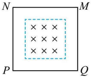 如图所示,正方形线圈 $M N P Q$ 边长为 1 m ,共 10 市,其内部存在一垂直纸面向里的正方形磁场,磁场的边长为 0.5 m ,磁感应强度逐渐增大且变化率 $\frac { \Delta B } { \Delta t } = 0.2 \mathrm {~T} / \mathrm { s }$ ,已知线圈的总电阻为 $4 \Omega$ ,那么线圈中产生的感应电流为( )
