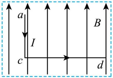 如图所示,长为 $3 L$ 的直导线折成边长分别为 $a c = L , c d = 2 L$ 直角导线,置于与其所在平面相平行的匀强磁场中,磁感应强度为 $B$ .当导线中通以大小为 $I$ ,方向如图的电流时,该通电导线受到的安培力大小为