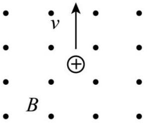 如图所示,磁场的方向垂直纸面向里,一带正电的粒子 $q$ 垂直于磁场方向向右运动时,受到的洛伦兹力方向为 | $\times$ | $\times$ | $\times$ | $\times$ | | :--- | ---: | :--- | :--- | | $\times q$ | $\times$ | $\times$ | $\times$ | | $\times$ | $\times$ | $\times$ | $\times$ | | $\times$ | $\times$ | $\times$ | $\times$ |
