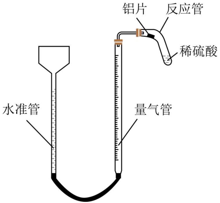 1. สมการสถานะของแก๊สอุดมคติ $\mathrm { pV } = \mathrm { nRT }$ อธิบายความสัมพันธ์ระหว่างปริมาณสาร, ปริมาตร, ความดันบางส่วน, และอุณหภูมิของแก๊สอุดมคติค่าคงที่ของแก๊สมวลโมลาร์ $R$ สามารถหาได้จากการใช้เครื่องมือทดลองที่แสดงไว้ ในการทดลองนี้ ให้ขัดและชั่งน้ำหนักแผ่นฟอยล์อะลูมิเนียม จากนั้นพันด้วยลวดทองแดงและวางไว้ที่ปากหลอดทดลอง ใส่กรดซัลฟิวริกเจือจางในปริมาณที่เพียงพอลงในหลอดทดลอง หลังจากอ่านค่าเริ่มต้นบนหลอดวัดแก๊สแล้ว ให้เคลื่อนหลอดทดลองเพื่อให้แผ่นฟอยล์อะลูมิเนียมเลื่อนลงไปในกรดซัลฟิวริกเจือจาง ข้อความใดต่อไปนี้ไม่ถูกต้อง? ( )