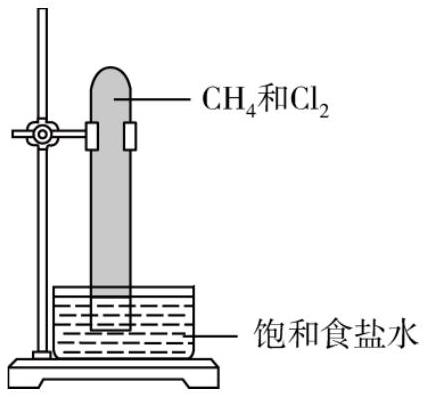 1. ตามที่แสดงในแผนภาพ ภายใต้สภาวะแสงที่เหมาะสม ขวดทดลองที่มี $\mathrm { CH } _ { 4 }$ และ $\mathrm { Cl } _ { 2 }$ ถูกคว่ำลงในอ่างน้ำที่มีสารละลายเกลืออิ่มตัวสำหรับการทดลอง ปรากฏการณ์ที่ไม่สามารถเกิดขึ้นได้คือ ( )