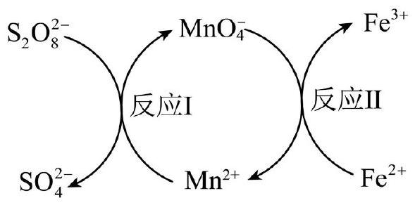 Solution: A. Theo hình vẽ, $\mathrm { S } _ { 2 } \mathrm { O } _ { 8 } ^ { 2 - }$ có thể oxy hóa $\mathrm { Mn } ^ { 2 + }$ thành $\mathrm { MnO } _ { 4 } ^ { - } , \mathrm { MnO } _ { 4 } ^ { - }$ và oxy hóa $\mathrm { Fe } ^ { 2 + }$ thành $\mathrm { Fe } ^ { 3 + }$, do đó có thể thấy $\mathrm { S } _ { 2 } \mathrm { O } _ { 8 } ^ { 2 - }$ có thể oxy hóa $\mathrm { Fe } ^ { 2 + }$ , do đó $\mathrm { S } _ { 2 } \mathrm { O } _ { 8 } ^ { 2 - } , \mathrm { Fe } ^ { 2 + }$ không thể tồn tại với số lượng lớn trong dung dịch nước, nên A là sai; B. Trong phản ứng I, $\mathrm { Mn } ^ { 2 + }$ chuyển hóa thành $\mathrm { MnO } _ { 4 } ^ { - }$, hóa trị của mangan tăng lên, trong phản ứng I, $\mathrm { Mn } ^ { 2 + }$ là chất khử, do đó B đúng; C. Khi phản ứng I tái sinh, $\mathrm { Mn } ^ { 2 + }$ bị oxy hóa thành $\mathrm { MnO } _ { 4 } ^ { - } , \mathrm { S } _ { 2 } \mathrm { O } _ { 8 } ^ { 2 - }$ có 2 nguyên tử -1 $\mathrm { O } , \mathrm { S } _ { 2 } \mathrm { O } _ { 8 } ^ { 2 - }$ được khử thành $\mathrm { SO } _ { 4 } ^ { 2 - }$ , hóa trị - 1 giảm xuống $- 2,1 \mathrm {~mol} \mathrm {~S} _ { 2 } \mathrm { O } _ { 8 } ^ { 2 - }$ chuyển 2 mol electron, theo định luật bảo toàn electron, khi tái sinh $1 \mathrm { molMnO } _ { 4 } ^ { - }$ tiêu thụ ${ } ^ { 2.5 \mathrm { molS } _ { 2 } \mathrm { O } _ { 8 } ^ { 2 - } }$ , do đó C là đúng;