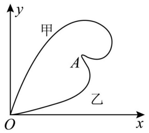 39 .《三国演义》脍炙人口,诸葛亮才智超群,张飞勇冠三军,在入川时,诸葛亮与张飞击掌为誓约定先到泣水关者为胜。诸葛亮与张飞同时从 $O$ 点出发,如图所示,路线甲是张飞的行军路线,路线乙是诸葛亮的行军路线,$A$ 点是涪水关,途中张飞"义释严颜",一路畅通无阻,先到涪水关。下列说法正确的是( )  (1)两路大军的平均速度相等 (2)张飞的平均速度大于诸葛亮的平均速度 (3)两路大军的路程不相等 (4)张飞的瞬时速率一直大于诸葛亮的瞬时速率