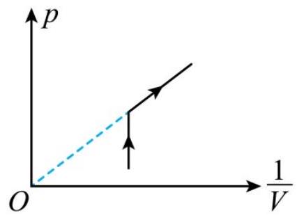 如图所示为一定质量理想气体状态变化时的 $p - \frac { 1 } { V }$ 图像,变化过程按箭头进行,根据图像可判断出气体的温度