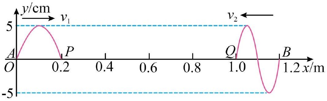 26.如图所示,两位同学分别拉一根长为 1.2 m 的绳两端 $\mathrm { A } 、 \mathrm {~B} , ~ t = 0$ 时刻,两同学同时抖动绳子两端,使 A、B 开始在坚直方向做简谐振动,产生沿绳传播的两列波,振源为 A 的波波速为 ${ } ^ { ~ } { } ^ { ~ 1 }$ ,振源为 B 的波波速为 ${ } ^ { ~ } { } ^ { ~ 2 }$ 。 $t = 0$ 4 s 时,两列波恰好传播到 $P , Q$ 两点,波形如图所示,则( )