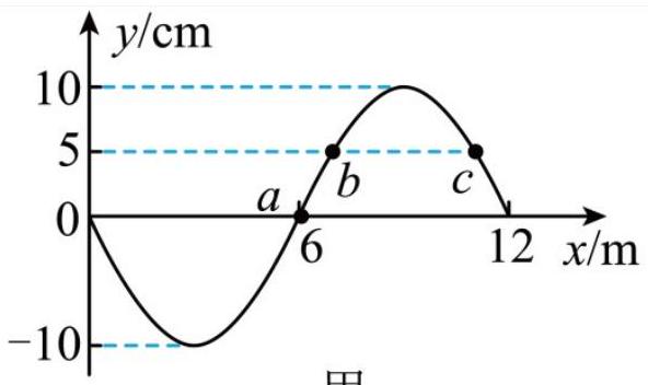 27 .如图甲所示为一列沿 $x$ 轴传播的简谐横波在 $t = 2 \mathrm {~s}$ 时刻的波的图象,$a 、 b 、 c$ 为介质中的三个质点,图乙表示该波 $x = 6 \mathrm {~m}$ 处 $a$ 质点的振动图像,下列说法正确的是( )  甲  乙
